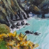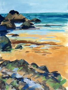 ‘Summer Beach Poldhu’, mixed media, image c. 10″x14″ » ‘Summer Beach Poldhu’, mixed media, image c. 10″x14″ •